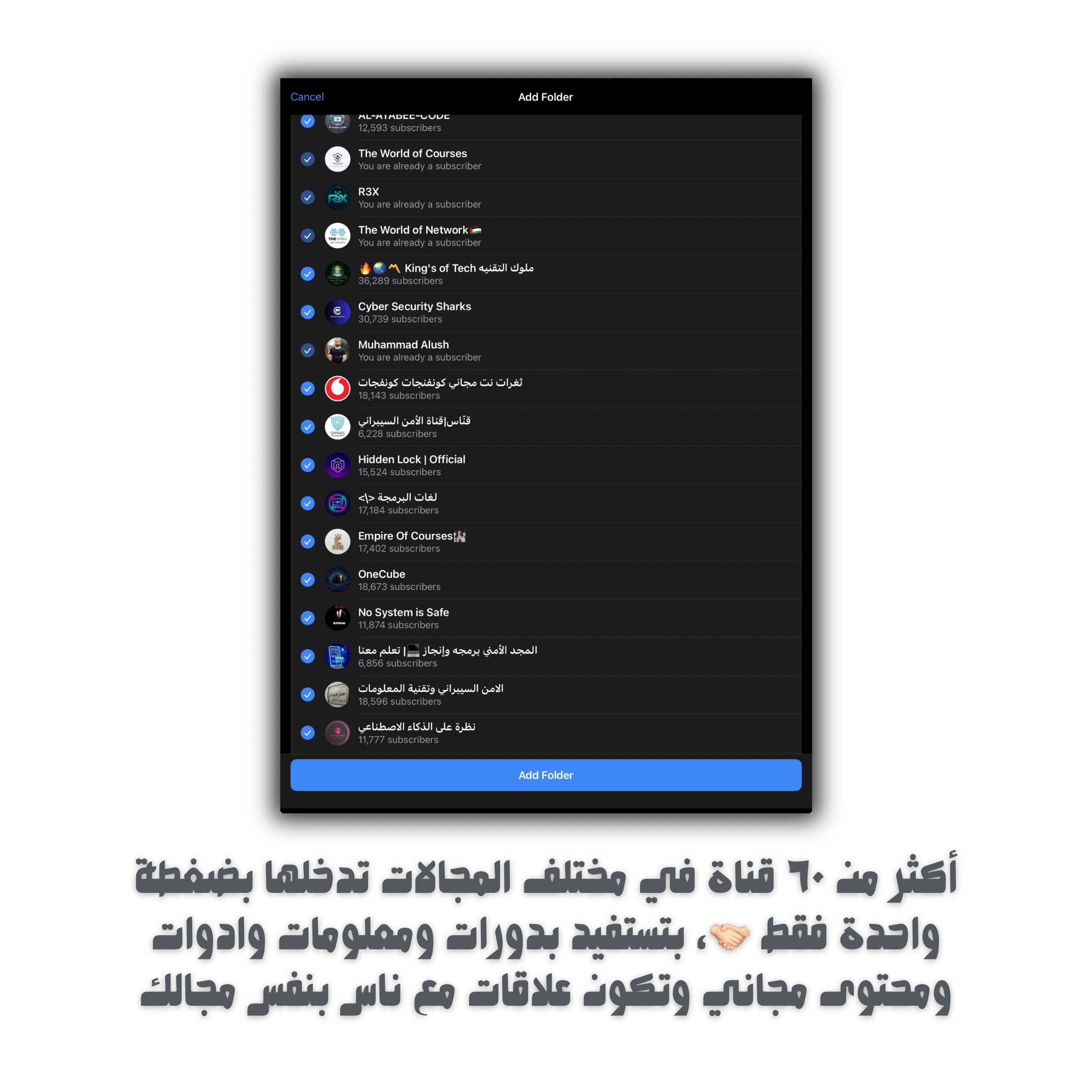 � باقة قروبات تلجرام التقنية (أكثر من 60 قناة) – الأمن السيبراني + البرمجة + التصميم